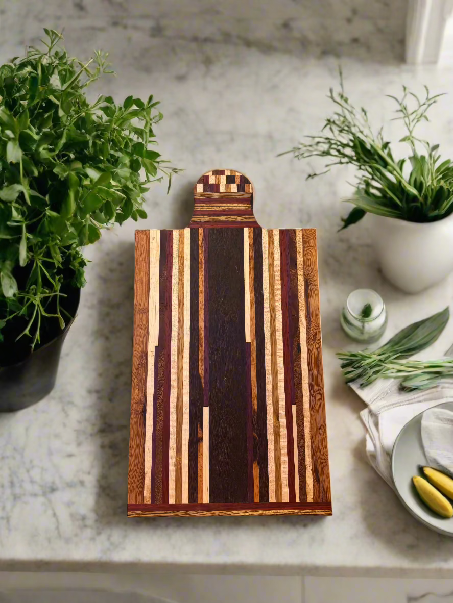 A one-of-a-kind cutting board made from reclaimed wood, showcasing unique grains and natural charm. Truly a functional piece of art for your home.